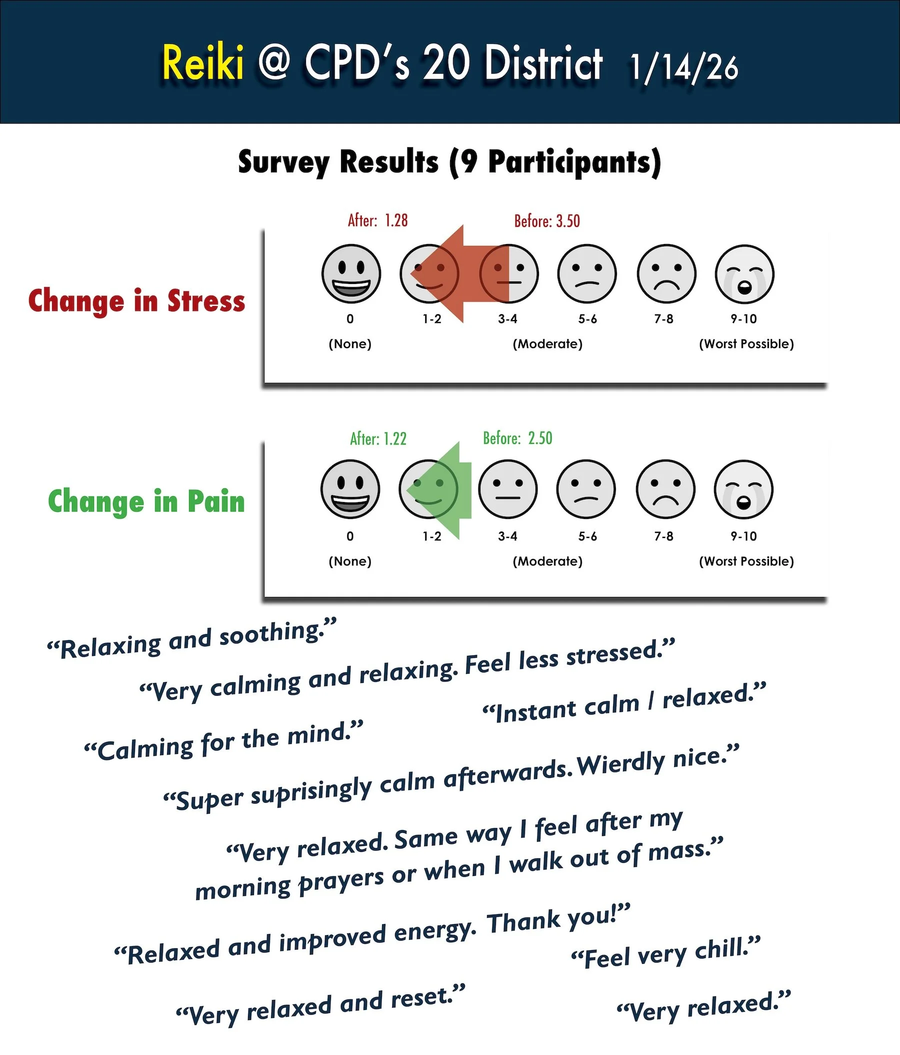The 20th District is bustling, so we were glad a few folks were able to take a short break to join us for some Reiki.